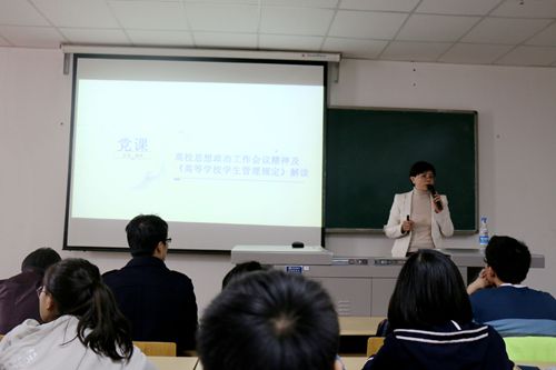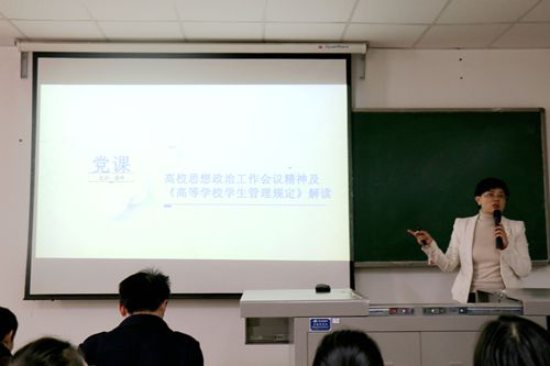 首先由杨扬老师向全体学员介绍此次培训的注意事项和课程安排。她强调党课培训纪律的重要性,并对结业考试和优秀学员的选拔进行介绍,明确了党课学习的严肃性与纪律性。随后,潘书记做主题报告,传达高校思想政治工作会议精神并对《高等学校学生管理规定》进行解读。她指出我们要认真学习领会习近平总书记重要讲话,认识高校教育发展的重要性,坚持以马克思主义为指导,全面贯彻党的教育方针,牢牢掌握党对高校工作的领导权,把思政工作贯穿教育教学全过程,整体推进高校党政干部和共青团干部、思想政治理论课教师和哲学社会科学课教师、辅导员班主任和心理咨询教师等队伍建设。