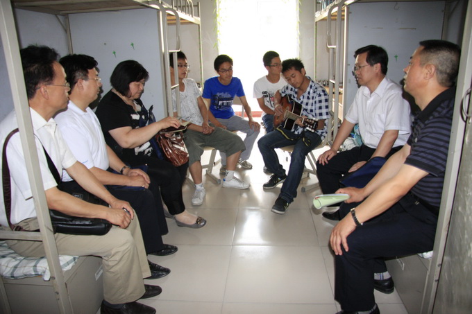 首先,各位领导们参观了12#楼公寓,与同学们交流,谈笑间,浓郁的公寓文化氛围散播开来。一首《中国军魂》唱响12#楼党支部,欢迎前来的领导们,把现场氛围推向了高潮。验收在12#楼党员活动室展开。12#楼党支部书记张航对公寓党建工作的特色和亮点以及取得的成果做了汇报。学院党总支书记李嗣丞谈了自己的看法,总结了12#公寓党支部的亮点特色,他说:“公寓党支部是党总支与学生之间的桥梁,可以及时的传递党的政策给学生们,同时公寓党支部也很好的维护了学校的稳定,把学习,创新,文化综合在一起,有目标,使得这里的建设更为重要。”党总支副书记潘瑞也对学生党员的能力进一步肯定“这里的学生党员们很优秀,党支部通过各项活动锻炼了他们的能力,这也是我们的目的之一。”随后,党外人士代表晋晓勇,学生代表,离退休职工代表刘慧英进行了交流发言。大家都肯定了12#公寓党支部把公寓当做课堂之外的知识、文化、精神融合的港湾,是育人的场所,是把做学问与做人有机结合的阵地的这一做法。在场的党员及教师代表对12#楼公寓党支部进行了测评投票。