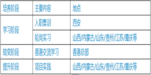 注:轮岗实习和项目实践将根据个人专业方向及公司业务做出安排,18个月培养计划完成且通过考核者,将安排具体工作岗位,公司也将持续关注个人职业生涯发展