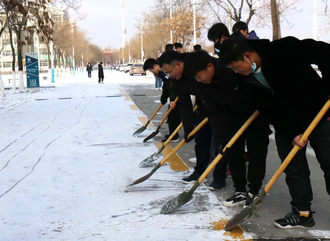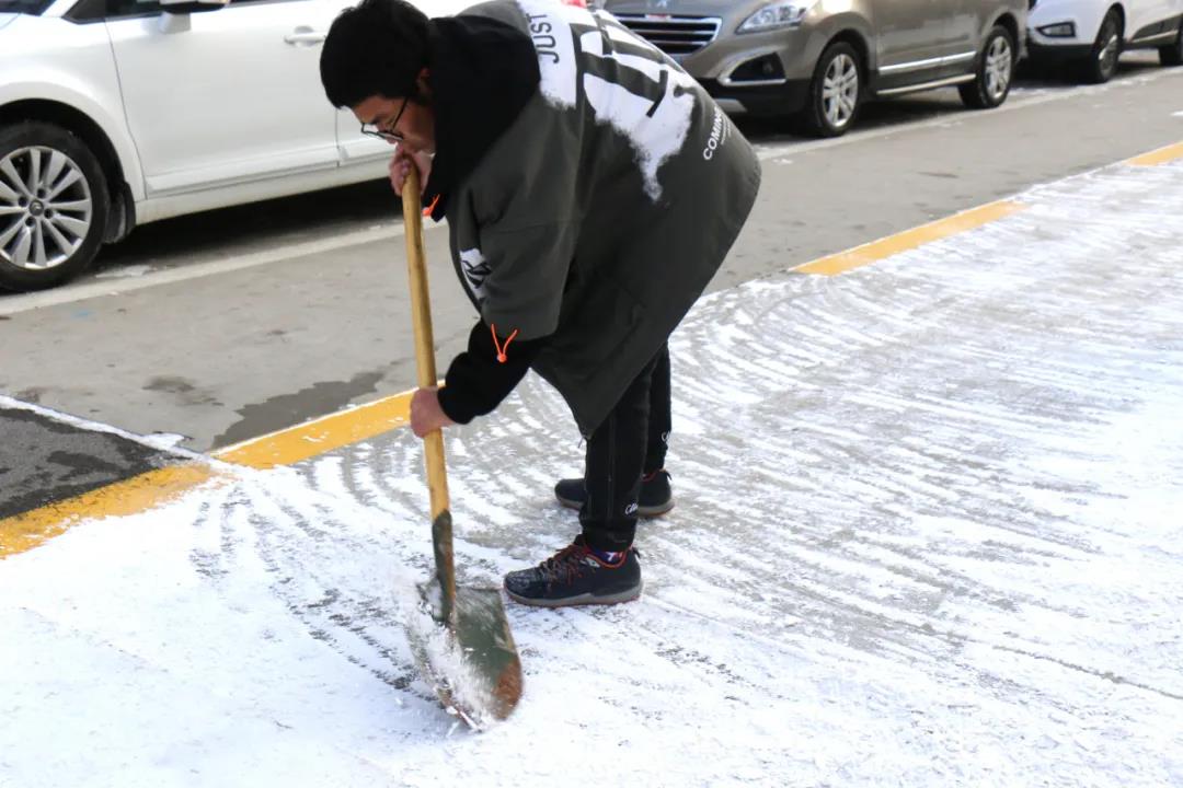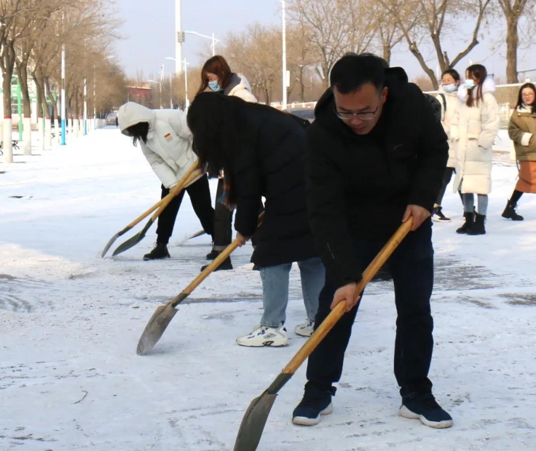 扫雪现场,同学们各司其职,有的在前面奋力铲雪,有的在后面用扫把扫雪,有的推雪。冷列的北风和零下十多度的低温使扫雪工作导常艰难,同学们的手和脸都冻得通红。然而,这一切丝毫没有影响大家的热情和工作效率,在各位老师的带领下,同学们发扬了吃苦耐劳、顽强拼搏的精神,大家团结协作,顶着寒风,将分担区的积雪全部清扫干净。同学们干劲十足的身影感染了每一个路过的人,大家纷纷向扫雪的同学们投去了赞许的目光。经过几个小时的奋战,扫雪任务圆满完成,虽然室外气温依然很低,但是同学们劳动的热情和团结的力量让这个冬日变得格外温暖。