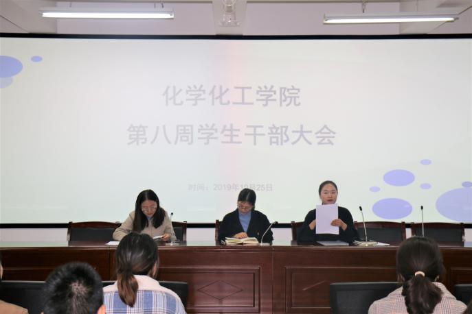 于知化楼115报告厅顺利召开新一届学生干部会议,学生办公室主任王艳梅老师和辅导员马丽蓉老师、马洁老师出席会议,全体学生干部参加。
