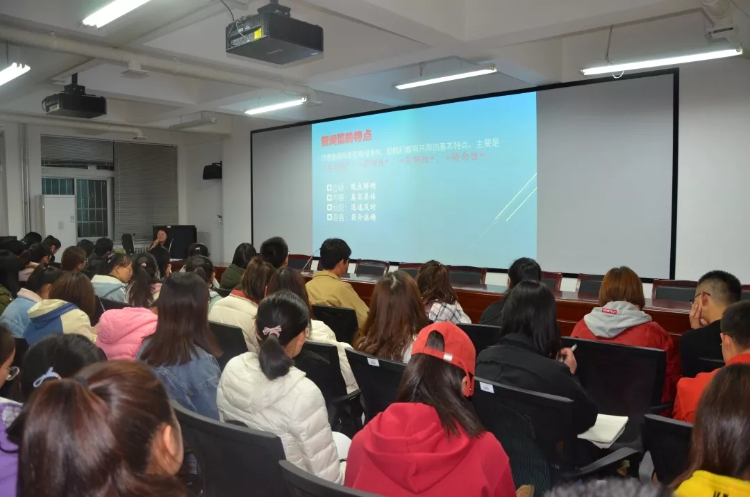“如何写出一篇精彩的新闻稿?新闻写作过程中应该注意什么问题?”围绕这两个问题,马丽蓉老师分享了她自己对新闻写作的认知与感受。马老师先向大家介绍了新闻的几种类型及新闻稿的六要素等知识点,她从新闻稿的标题、导语、主体、结语四个方面分别阐述了撰写新闻稿的方法和技巧,并为同学们指出了在撰写新闻稿时容易出现的常见错误和几点注意事项。她强调新闻稿写作要坚持真实性,把握时效性,深入实际,充分占有材料,要想写好新闻稿,平时应养成多读多看多钻研新闻报道的好习惯。同学们在听完老师的讲解后意犹未尽,更有同学主动提出自己的疑问,老师一并详尽解答。最后,马老师表示了对同学们的真挚祝愿,她说:“写新闻是一个熟能生巧的过程,只要做一个有心人,多练习写稿,有意识地去提高,终有一天会写出精彩的新闻稿。”