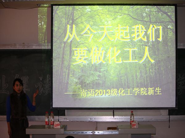 “从今天起我们要做化工人!”李平老师以这样的开场寄语2013级新生。接着。她结合PPT演示主要针对化工系带领大家了解化工,讲述了化工的发展、辉煌历史及化工产业的高潮,并希望同学们能够关注化工前沿,做一个有目标、有理想的化工人。