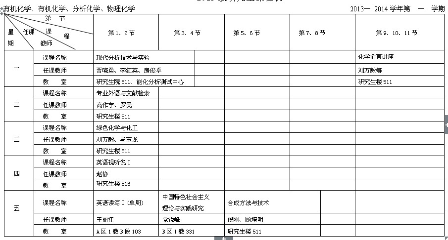 2013级全日制硕士研究生课表-无机化学、有机化学、分析化学、物理化学