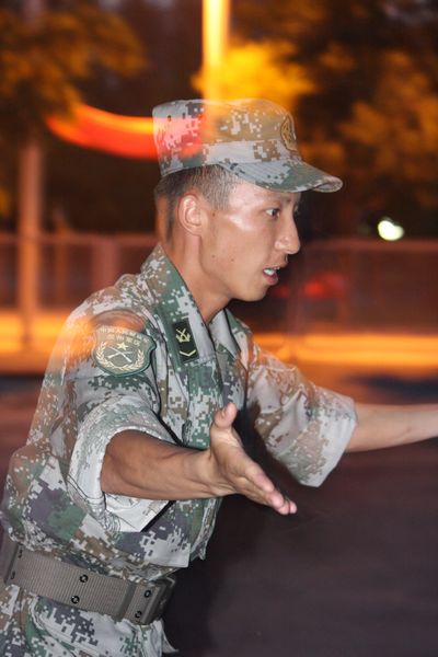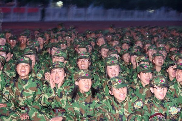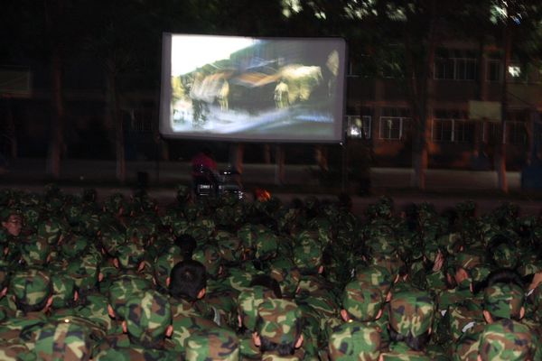 利用晚训时间组织2011级全体大一军训学生在C区足球场观看红色电影。