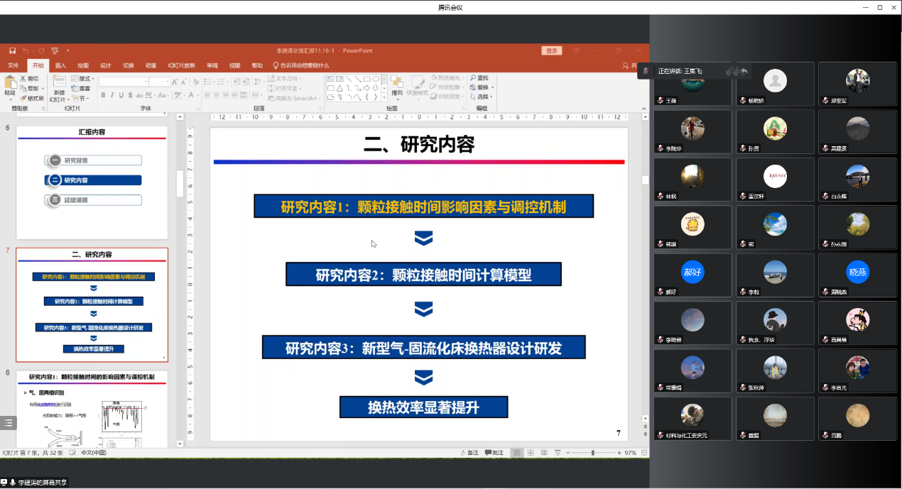 李建涛博士以“气-固流化床换热器换热强化研究”为题作了报告,主要介绍了新型气-固流化床换热器内部颗粒接触时间影响因素与调控机制,基于上述研究成果建立了颗粒接触时间计算模型,并在此基础上实现了新型气-固流化床换热器设计研发,为实际工业过程中的换热器设计奠定理论基础。