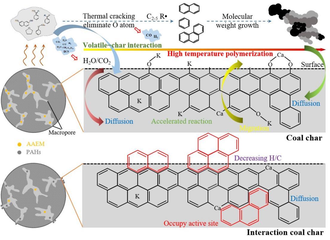 该项成果基于两段式固定床反应器从含氧复合物角度解耦研究了挥发分-半焦交互作用行为。交互行为本质是含氧化合物脱氧、脱氢和开环再聚合过程,并会抑制脱酸和脱酮反应。交互作用过程聚合产生的多环芳烃(PAHs)占据半焦活性位点是造成其失活主要原因,C–O结构是煤焦活性位点最直观的表达形式。酚羟基、羧基、醛基和醚基基团在交互作用过程表现出依次降低的活性抑制行为。有针对性地调控液相产物向醛类和醚类化合物分布,有利于降低交互作用强度,提高气化炉的可靠性和能源效率,拓展了气化炉设计和优化思路。