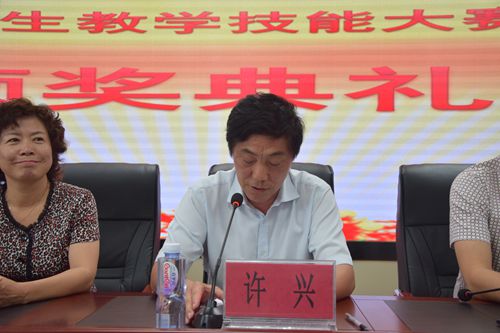 副校长许兴在颁奖典礼中致辞,他指出:本次比赛是自治区教育厅在新形势下促进教师教育课程改革,引导各高等院校为基础教育服务,培养学生基本教师职业技能的一次重要举措,大赛不仅是一次学生学业成就和才艺的展示会,也是一次激励和鼓舞广大青年学子投身教育、服务教育、奉献教育的动员会,更是一次全区化学教育教学成果的博览会。他对在场同学们提出几点希望,希望同学们能够勤奋学习、打牢基础、脚踏实地、学以致用,把个人梦和职业梦融入国家梦和民族梦,让青春无悔,让人生更加出彩!