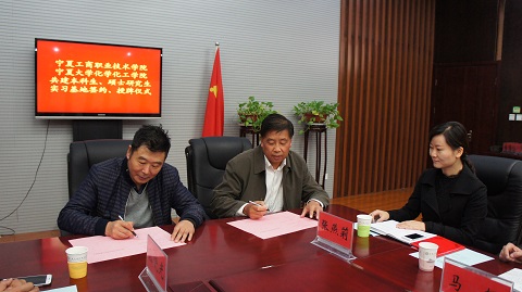 会议期间刘万毅院长和工商学院化工系马辉主任分别介绍了本科生、硕士研究生实习基地共建情况;刘炜院长发表讲话,希望双方能够加强合作,互利共赢,打开本科院校和职业技术院校的合作大门。李建军副院长和刘万毅院长代表双方签定了共建实习基地的协议;常海波副处长向工商学院薛新巧等4位教师颁发了实习指导教师聘书;刘万毅院长和李嗣丞书记分别为宁夏工商职业技术学院本科生、研究生实习基地授牌。双方还就两院今后在教学科研管理、科技研发、人才培养、基地建设等一系列深化合作进行了交流座谈。