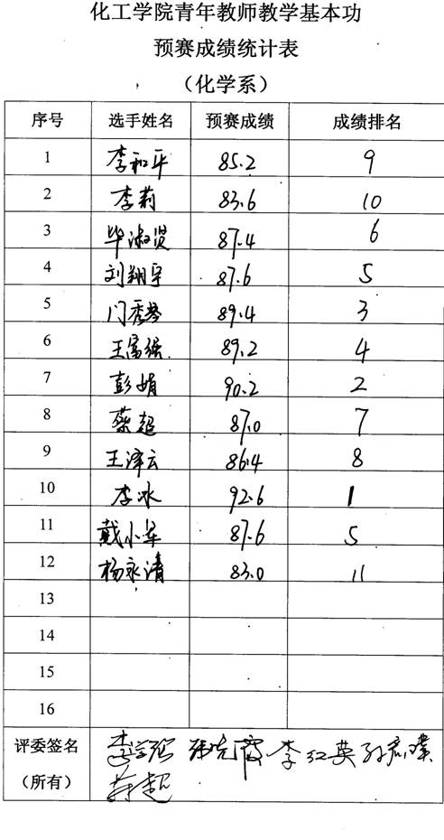 化学系成立了由李学强教授担任评委组长,李红英、韩晓霞、孙彦璞和蔡超任评委的比赛评委会。比赛经过选手们的激烈角逐,评委团认真细致、客观严谨的评判,最终李冰、彭娟和门秀琴分获前三名。