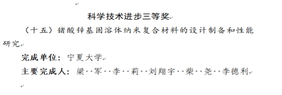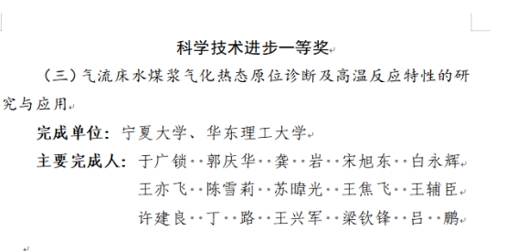 于广锁老师团队的“气流床水煤浆气化热态原位诊断及高温反应特性的研究与应用”获自治区科学技术进步一等奖;梁军老师团队的“锗酸锌基固溶体纳米复合材料的设计制备和性能研究”获自治区科学技术进步三等奖。