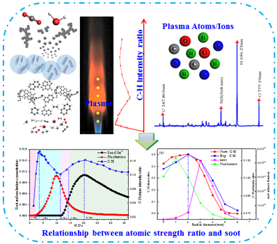 该工作结合实验与模拟多种手段提出了LIBS快速实现碳烟的一种量化火焰中碳烟生成机理演变的新方法。利用激光诱导击穿光谱(LIBS)和Ansys数值模拟方法,研究了火焰区域烃类原子强度比与碳烟生成的关系。通过详细的化学动力学模拟,量化揭示了不同阶段碳烟的演化规律和形成机制。研究表明,C-H强度比的轴向二次函数分布表征了火焰中初始碳烟的形成位置以及从初始碳烟到成熟碳烟的过渡阶段变化;而径向不同高度火焰的C-H强度比在0.10 ~ 0.13范围内为主要的产烟核心区;模拟结果进一步发现,火焰上游含有丰富的含氧物质,使碳被氧化而未转化为碳烟前驱体,但在火焰中游,含氧物质被消耗,大量的碳烟前驱体(A1、A1−、C2H2等)开始生成。