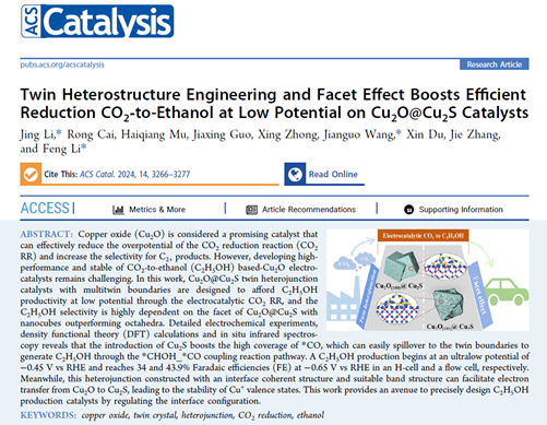 李丰/李晶博士在电催化CO2还原制乙醇催化剂设计及机理研究方面取得重要研究进展。该工作以“Twin Heterostructure Engineering and Facet Effect Boosts Efficient Reduction CO2-to-Ethanol at Low Potential on Cu2O@Cu2S Catalysts”为题发表在催化领域国际顶级期刊《ACS Catalysis》(IF = 12.9,中国科学院一区TOP),并被研之成理、邃曈科学云等公众号平台转载报道。该论文第一作者为李晶博士,李丰博士和浙江工业大学王建国教授为共同通讯作者,污污漫画