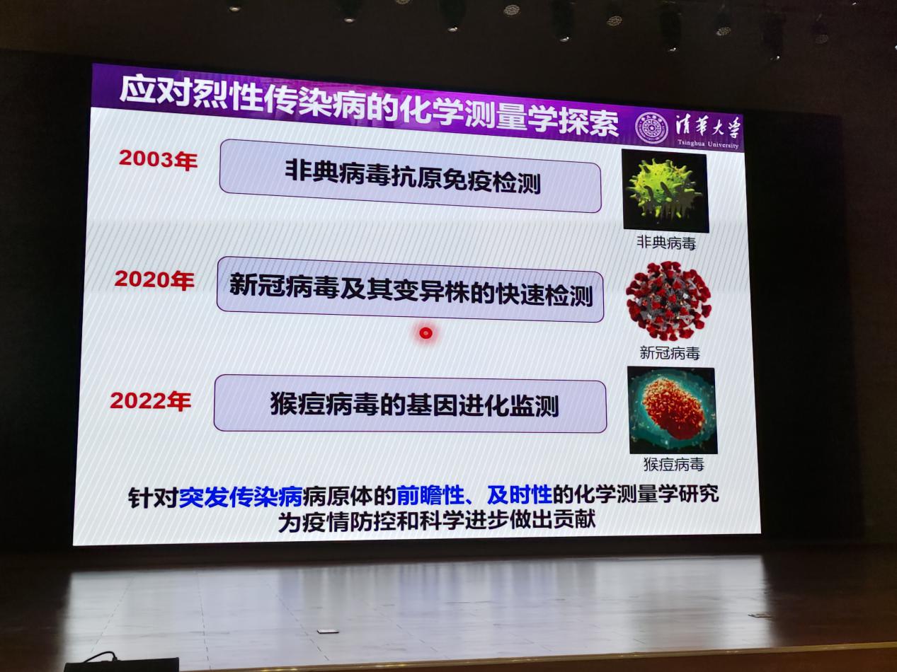 李景虹院士结合化学测量学领域丰硕的科研成果,高屋建瓴的指出,病原体快速检测和病原学分析的化学测量学方法是应对突发烈性传染病的国家战略性技术储备。基于在分子探针精准识别目标物和下游信号放大与信号转导技术方面的多年耕耘,李景虹分享了其科研团队在非典病原体抗原免疫检测、新冠病毒及其变异株的快速检测、猴痘病毒基因进化监测等方面的最新研究成果,展示了我国分析化学家的家国情怀和责任担当。