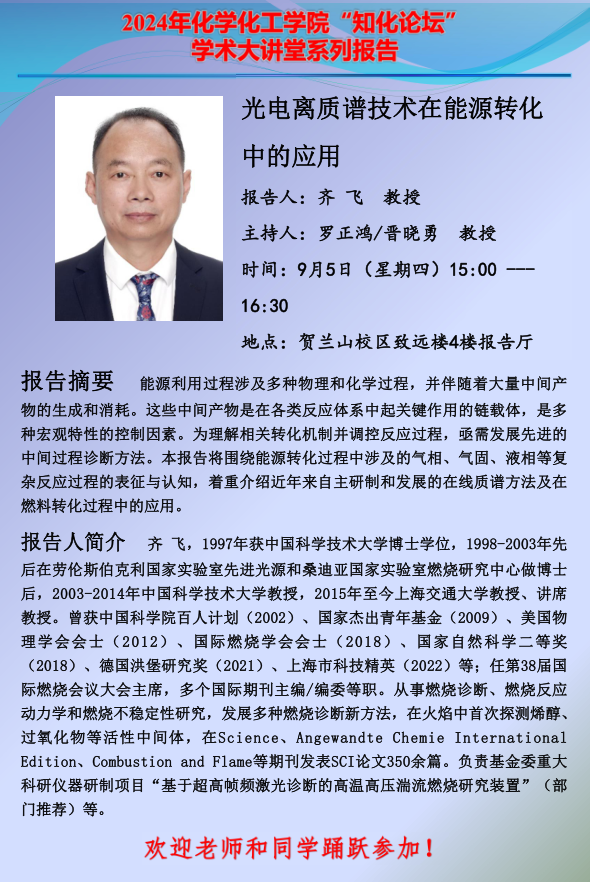 2024年“知化论坛”学术大讲堂系列报告活动在贺兰山校区致远楼四楼会议室成功举行。国家杰出青年基金获得者、上海交通大学齐飞教授以“光电离质谱技术在能源转化中的应用”为题做了学术报告,晋晓勇教授主持本次报告会。