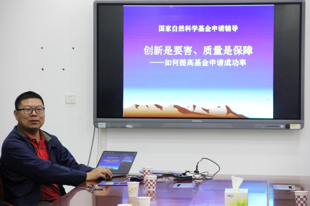 张鹏飞书记及青年教师张军军副教授作报告,与学院科研人员分享国基金申报及写作经验。