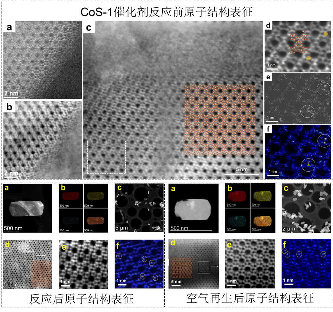 刘晰教授使用了低剂量条件下HAADF成像和集成差相衬成像(iDPC)技术组合,确保能够分别对重金属Co和硅酸盐沸石框架进行原子结构成像。通过精确控制电子辐照,结合原子分辨的iDPC和相应的HAADF-STEM图像,可以观察到沸石上随机分布的钴单原子位点,它们占据了10-MR的T位点,这些Co原子以孤立的Coδ+–O–SiOx键的形式存在于硅酸盐沸石晶体中,形成了丰富的活性位点并具有极好的稳定性。该催化剂在丙烷脱氢中显示了极好的催化活性和稳定性,在经历反应结束后和空气氧化再生过程的电镜表征结果表明,CoS-1催化剂中依然观察到只有孤立分散的Co位点而没有检测到Co纳米颗粒或团簇形成,证明CoS-1催化剂是丙烷脱氢的催化活性中心,且能够通过分子筛限域作用而稳定存在。这些图像为理解催化剂的活性中心、反应机理以及催化过程中的结构变化提供了直观且详尽的证据,及以此为设计高效催化剂提供了先进的物种结构表征技术重要支撑。