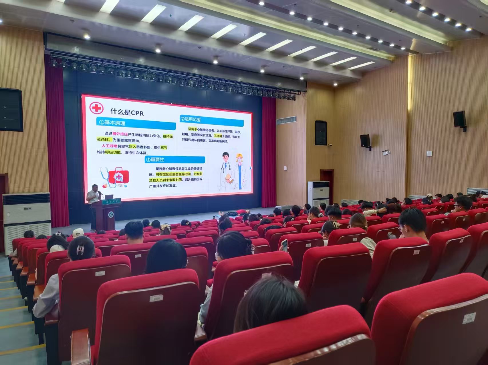 组织任建林、李晓曼两位老师为200多名一、二年级研究生开展了两场心肺复苏(CPR)急救技能专项安全培训。