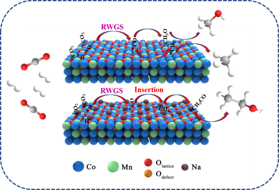 该项研究利用碱金属Na调控了CoMnO催化剂中Co-O的强度,促进*CO的非解离吸附,与反应产生*CHx发生C-C偶联反应促进了乙醇的形成。同时,结合多种表征手段探索了催化剂的构效关系。本研究为CO2加氢制乙醇催化剂的设计提供了参考。