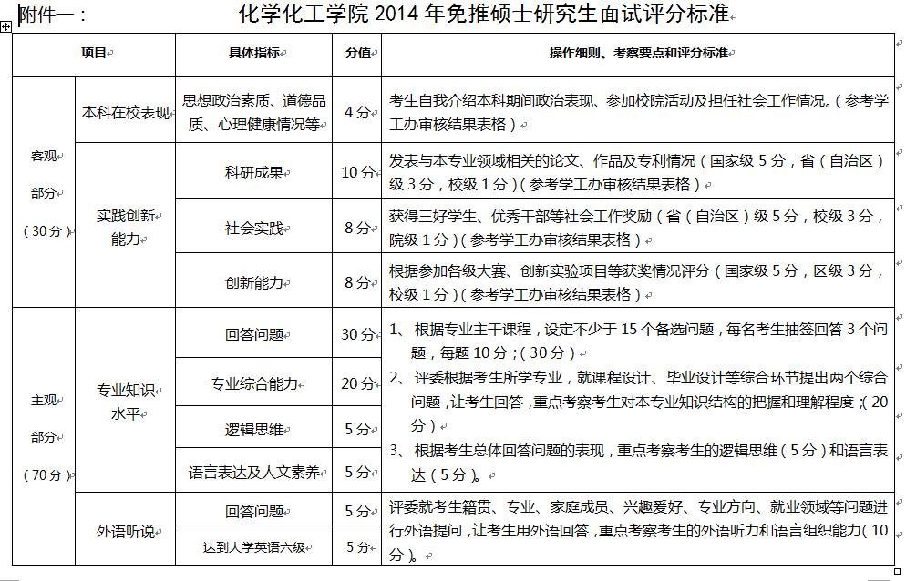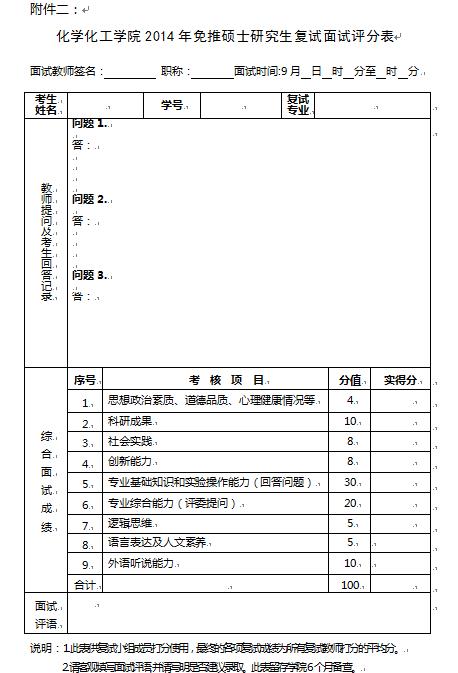 复试采取面试形式,总分为100分,每人时间控制在20分钟以内,复试成绩从高到低排序上报、公示。所有专业的复试内容应包括以下几项: