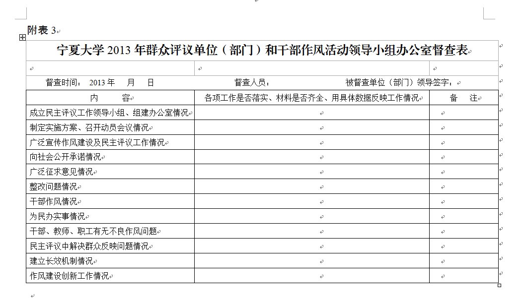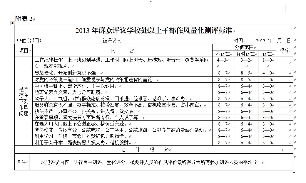 2013年群众评议处以上干部作风量化测评表》(附表2),9月20日前,将测评结果统计后上报纪委办公室。