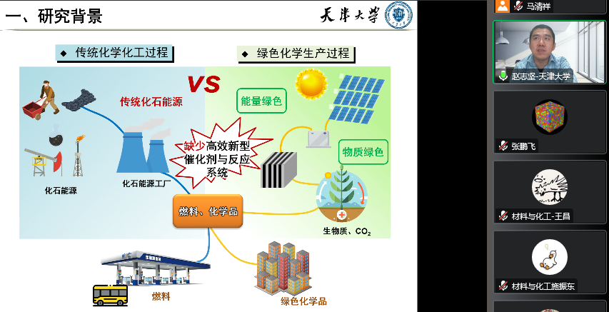 赵志坚教授围绕传统化学化工过程向绿色化工生产过程中催化剂开发和反应系统设计等方面的问题,通过理论计算的方面,对反应过程及反应催化剂进行模拟和设计。赵教授详细介绍了动态催化剂模型算法开发及其在反应过程催化剂设计方面的应用。最后,赵老师就大家感兴趣的问题进行了交流。