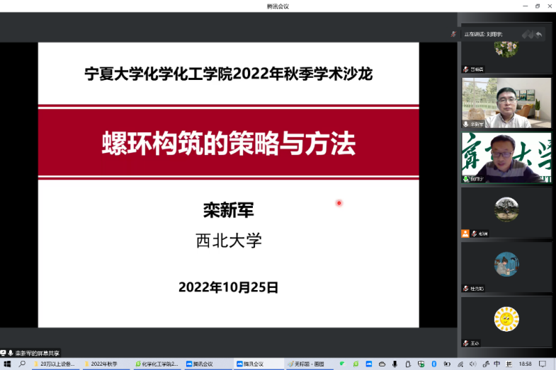 10月25日晚7点,污污漫画 2022秋季系列学术报告会在线上举行。西北大学化学与材料学学院院长、国家杰出青年基金获得者栾新军教授作了题为“螺环构筑的策略与方法”的学术报告,学院部分师生参加了此次报告,刘翔宇副院长主持报告。