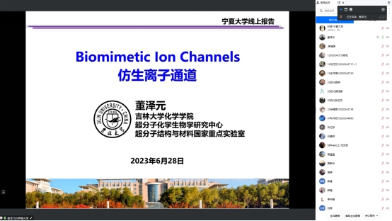 董泽元教授以“仿生离子通道”为题作了报告,重点围绕仿生离子通道的化学设计基础、孔道选择性的构筑以及生物体内的功能实现进行了介绍。报告主要介绍了螺旋聚合物的化学设计、合成及其作为钠、钾离子通道的应用。报告中,董老师详细总结了课题组近十多年的研究思路与成果。从配体的设计、单体的长度、螺旋孔道孔径的精确调控以及孔道直径对于离子的选择性及其机理进行了深入探究,实现了在选择性、效率上可以媲美天然细胞的仿生通道的构建。最后,报告介绍了将仿生离子通道用于活细胞以及生物体内的尝试,并实现了钾、钠离子的选择性传输,为离子传导阻滞类疾病的治疗提供了新思路。