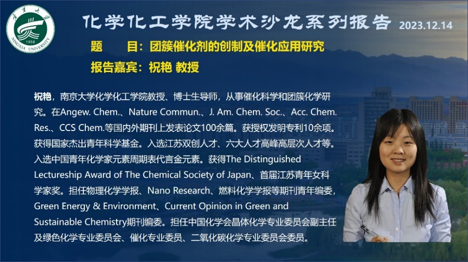 2023年学术沙龙系列报告会成功举办。国家杰出青年基金获得者、南京大学祝艳教授做了题为“团簇催化剂的创制及催化应用研究”的报告。