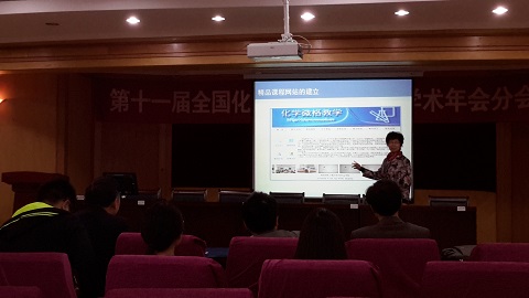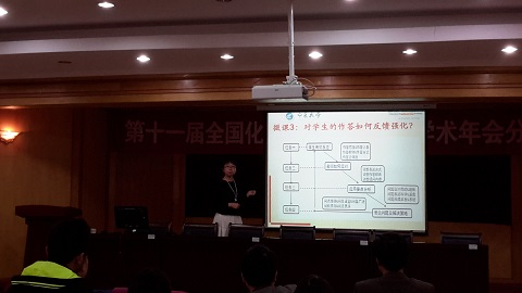 教师教育专业以打造特色专业为核心目标,从微格教学的实施模式、实施步骤、实施特色进行广泛的交流,并谈到了今后如何在微格发展的浪潮中锁定自己的位置,以及在“卓越师范生培养计划”的激励下坚守与改革进行深入的探讨。吴晓红教授谈到要将教师、硕士研究生、本科生三个群体形成本硕学习共同体;提出以项目化学习带动教师教育,全面提升师范生综合能力;以可视化教学设计提供师范生教学设计能力;以课堂观察评价体系促进师范生反思教学设计与实践的能力。并向各位学者介绍《化学微格教学》、《化学教学论实验》教材,受到广泛关注。化学课程与教学论硕士研究生孙婕介绍了“以培养化学师范生提问技能为主线的微课程设计研究”,在发言中,深入阐述了微格教学技能微课程设计的目的、设计思路,并展示多个设计案例与会场多位学者进行交流,整个汇报在与众多专家同仁在思想的碰撞下激烈讨论中进行。