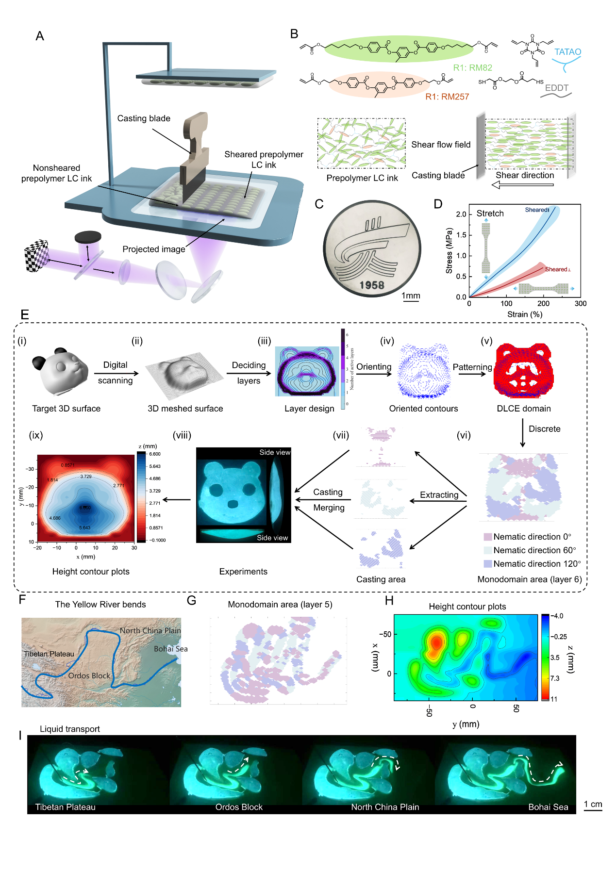 (省部共建煤炭高效利用与绿色化工国家重点实验室)冒杰副教授团队,在“化学工程与技术”教育部“双一流”学科建设经费持续支持下,取得了突破性进展。研究团队首次提出了一种剪切辅助数字光处理(DLP)4D打印介电弹性体策略。该方法通过对介电液晶弹性体(DLCEs)的力学性能进行时空编程,成功在电场驱动下实现了复杂三维结构的可控、可逆变形。在此基础上,团队引入逆向设计算法,完成了对目标三维形貌的高保真重构,为解决软材料可控变形及非线性力学行为设计等关键科学问题提供了全新的技术路径。实验结果显示,基于该策略发展的打印工艺与设计框架,成功实现了从仿生花朵到地形模型等多种复杂曲面的电驱重构,清晰展示了其在软体机器人、可植入生物医疗设备等领域的广阔应用前景。